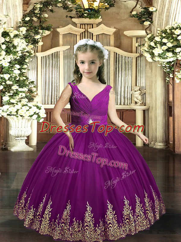 Floor Length Backless Little Girls Pageant Dress Wholesale Eggplant Purple for Party and Wedding Party with Embroidery