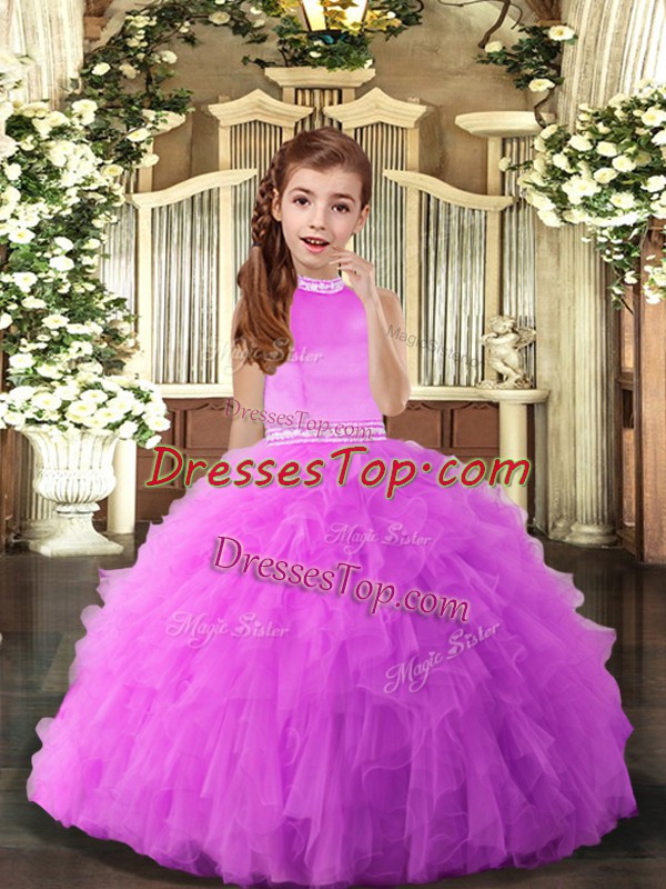 Floor Length Backless Little Girls Pageant Gowns Lilac for Party and Sweet 16 and Wedding Party with Beading and Ruffles