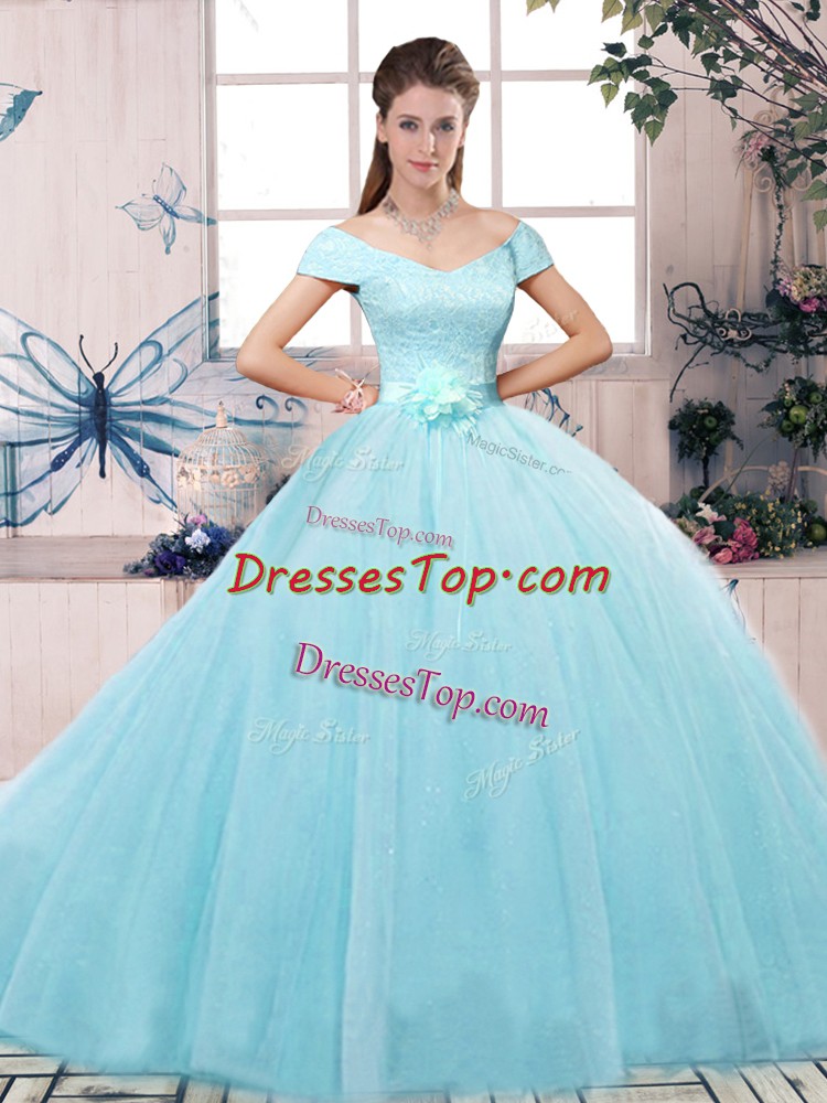 Floor Length Ball Gowns Short Sleeves Aqua Blue Quinceanera Dresses Lace Up