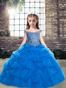 Floor Length Blue Child Pageant Dress Organza Sleeveless Beading