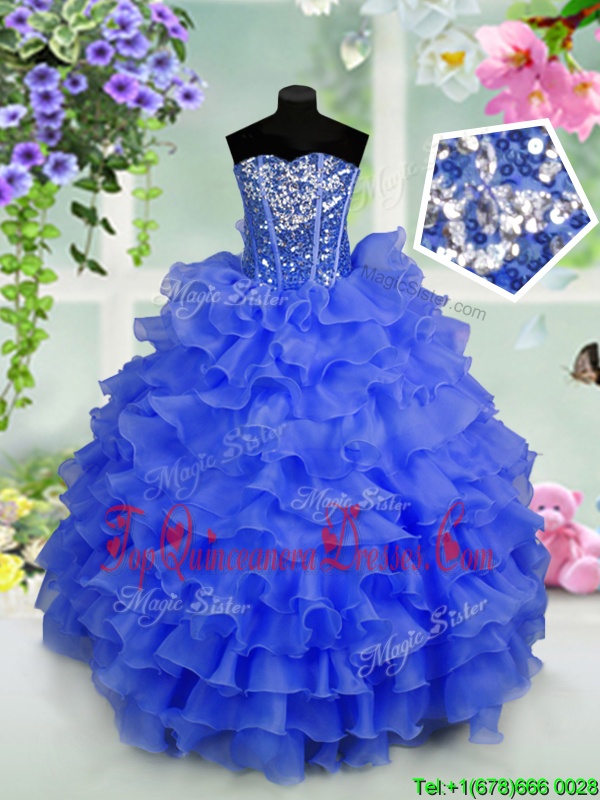 Floor Length Blue High School Pageant Dress Organza Sleeveless Beading and Ruffles and Pick Ups