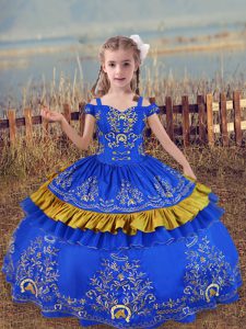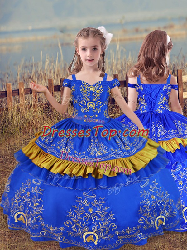 Floor Length Blue Pageant Gowns For Girls Off The Shoulder Sleeveless Lace Up