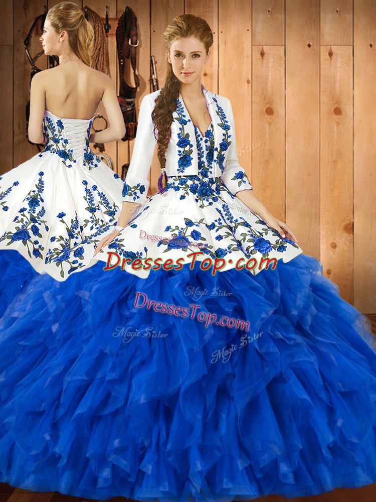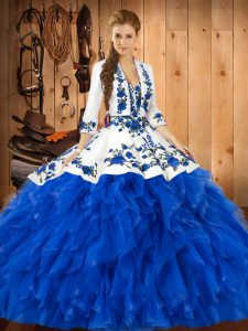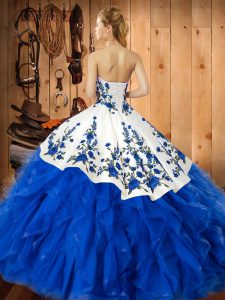 Floor Length Blue Sweet 16 Dress Satin and Organza Sleeveless Embroidery and Ruffles