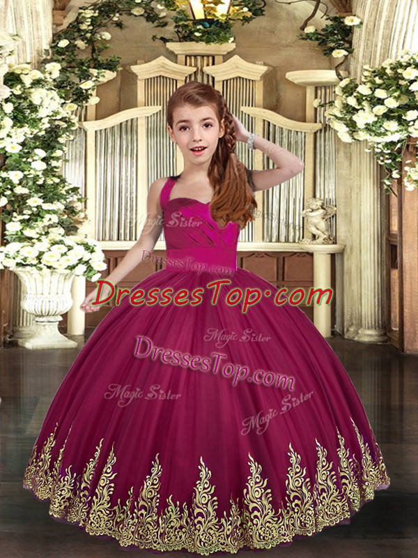 Floor Length Burgundy Little Girls Pageant Dress Wholesale Tulle Sleeveless Embroidery