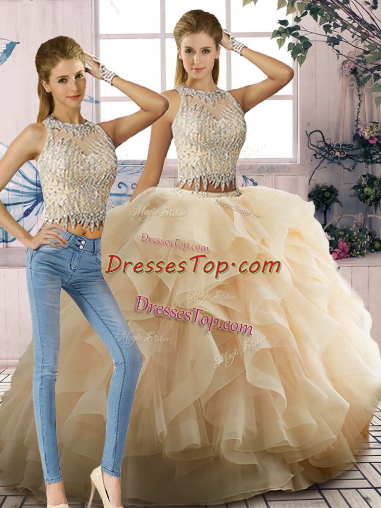 Floor Length Champagne Quince Ball Gowns Tulle Sleeveless Beading and Ruffles