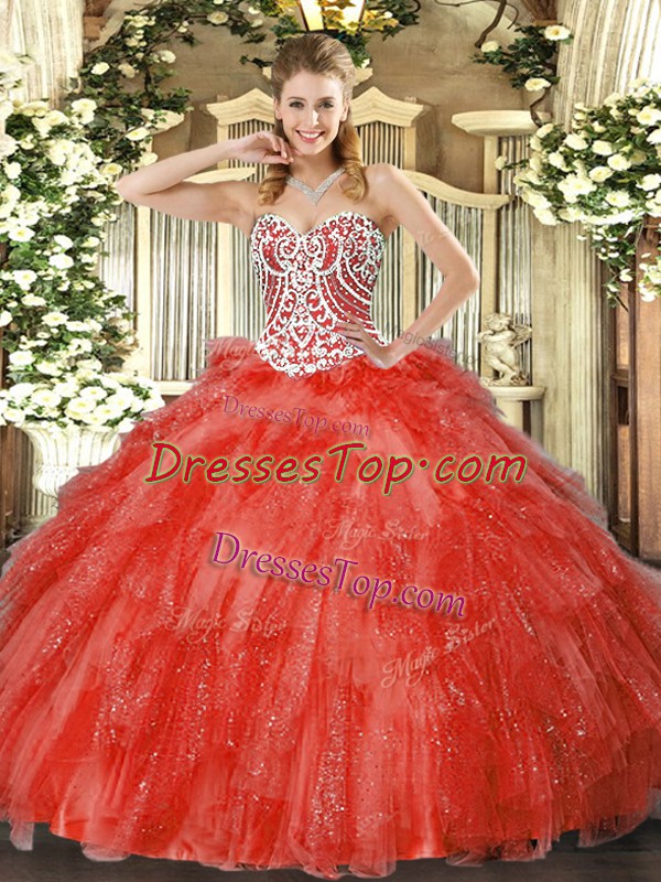 Floor Length Coral Red Quinceanera Gowns Tulle Sleeveless Beading and Ruffles