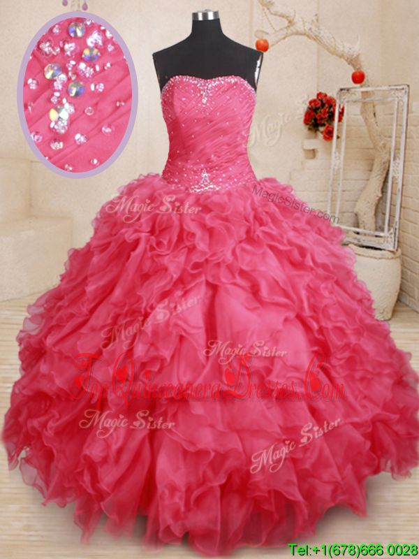 Floor Length Coral Red Sweet 16 Dresses Organza Sleeveless Beading and Ruffles