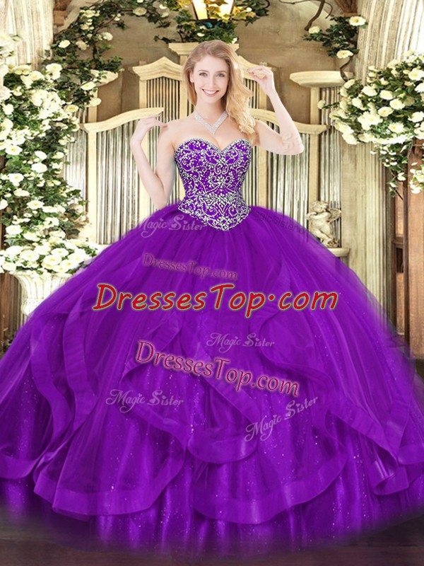 Floor Length Eggplant Purple Sweet 16 Quinceanera Dress Tulle Sleeveless Ruffles
