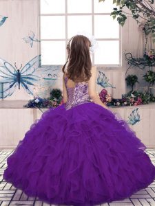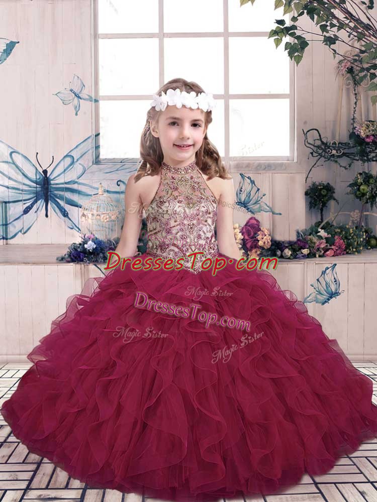 Floor Length Fuchsia Girls Pageant Dresses Tulle Sleeveless Beading and Ruffles