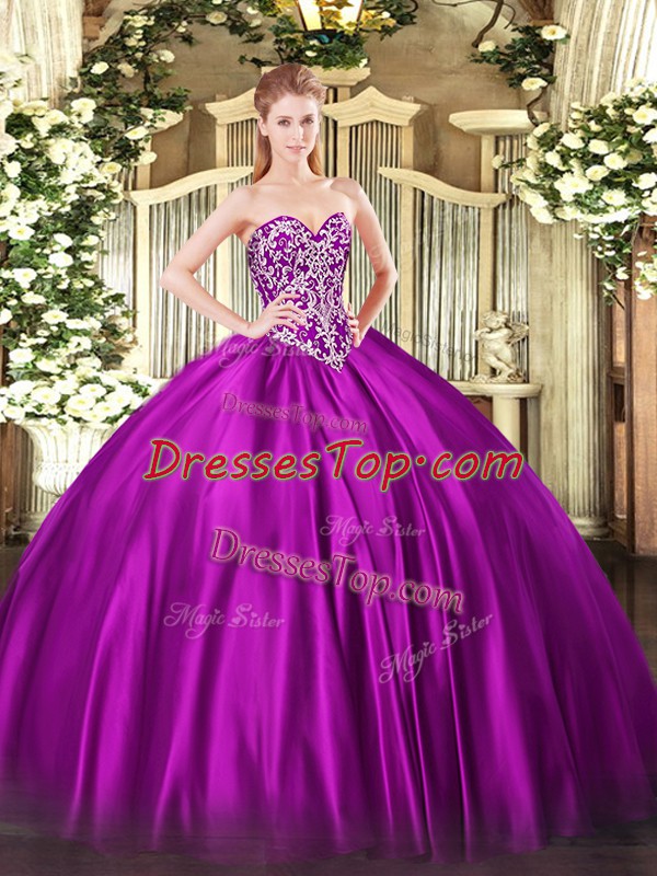 Floor Length Fuchsia Quinceanera Dress Satin Sleeveless Beading