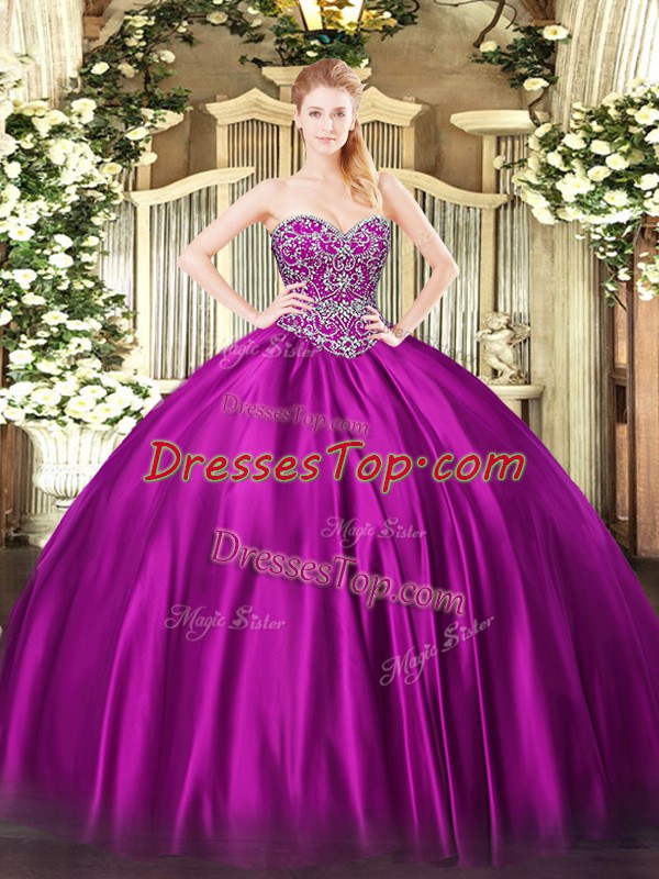 Floor Length Fuchsia Quinceanera Dresses Satin Sleeveless Beading