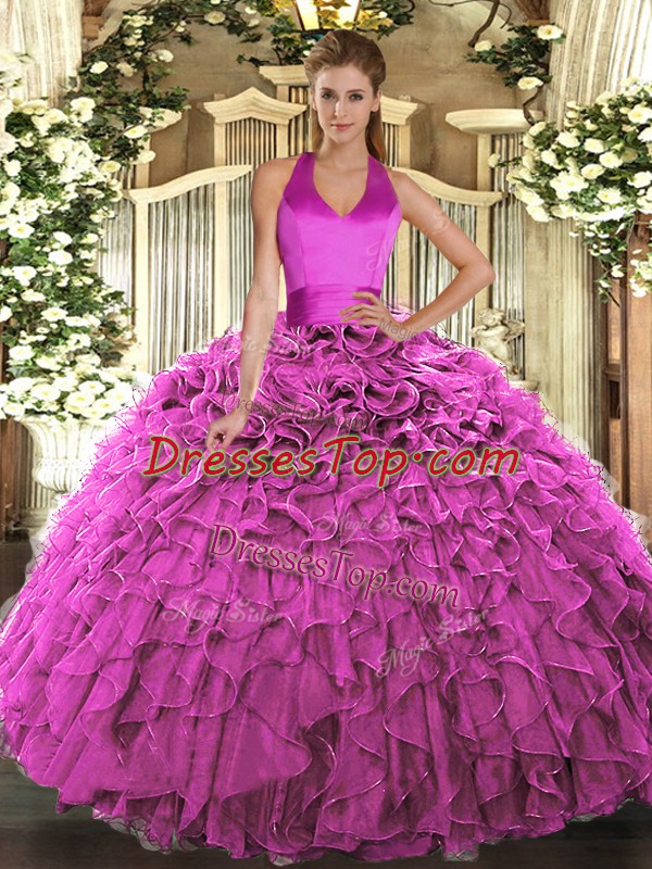 Floor Length Fuchsia Vestidos de Quinceanera Halter Top Sleeveless Lace Up