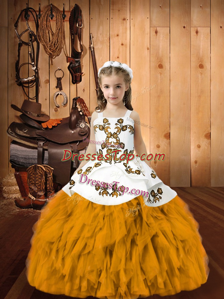 Floor Length Gold High School Pageant Dress Straps Sleeveless Lace Up