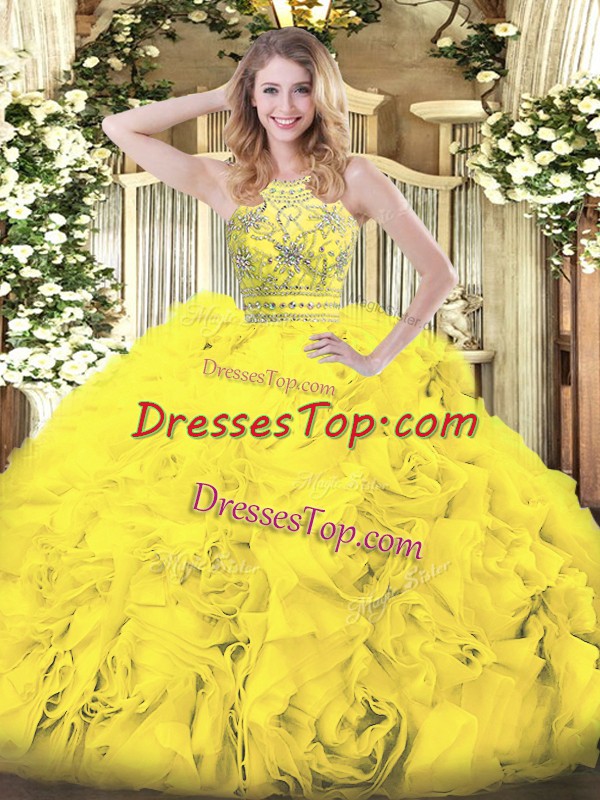 Floor Length Gold Quinceanera Dress Tulle Sleeveless Beading and Ruffles