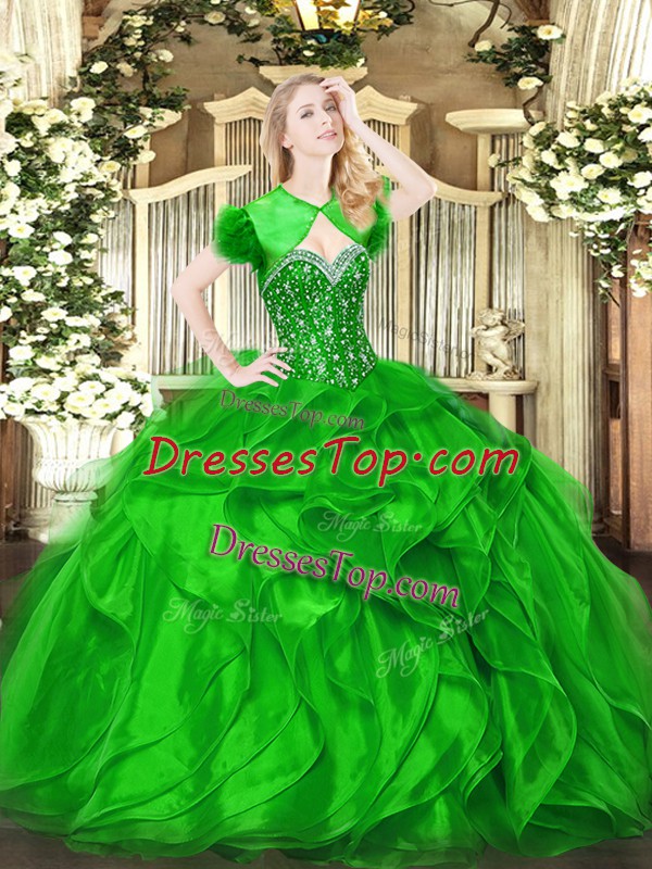 Floor Length Green Quince Ball Gowns Organza Sleeveless Beading and Ruffles