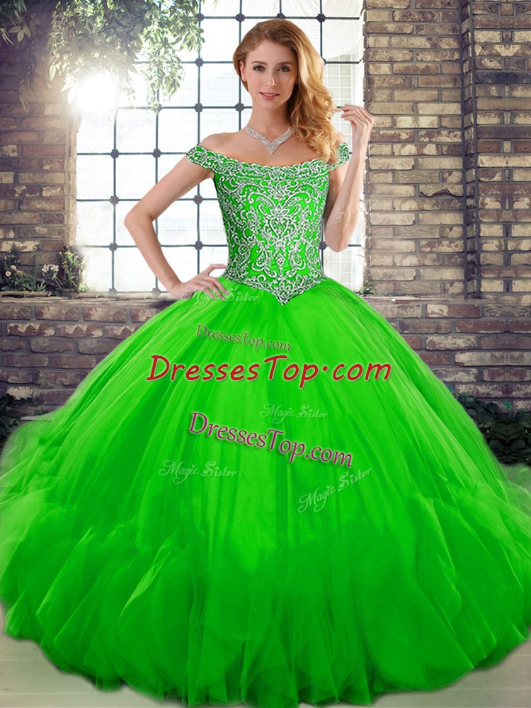 Floor Length Green Quinceanera Dress Tulle Sleeveless Beading and Ruffles