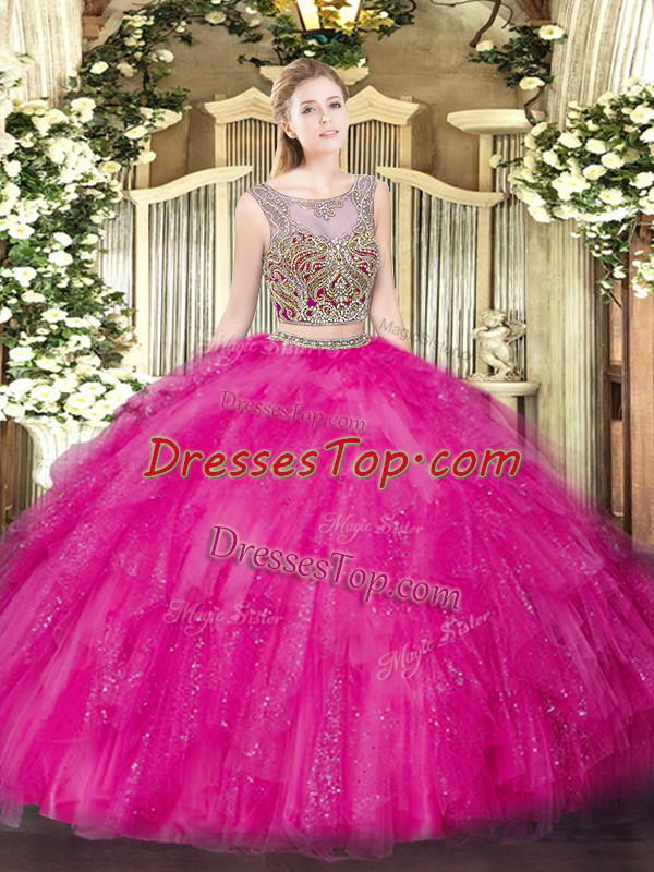 Floor Length Hot Pink 15th Birthday Dress Tulle Sleeveless Beading and Ruffles