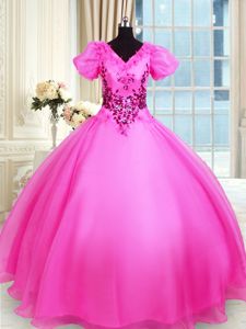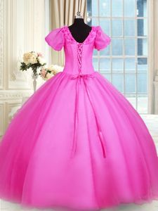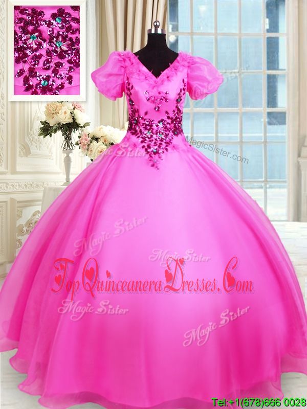 Floor Length Hot Pink 15th Birthday Dress V-neck Short Sleeves Lace Up