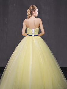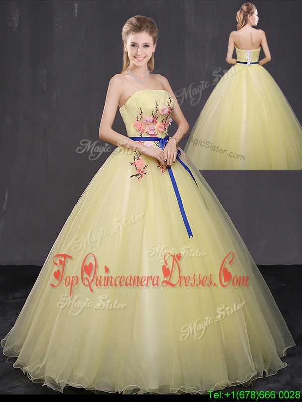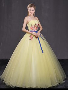 Floor Length Lace Up 15 Quinceanera Dress Yellow and In for Military Ball and Sweet 16 and Quinceanera with Appliques