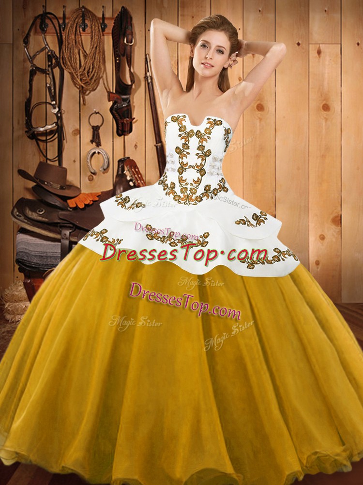 Floor Length Lace Up 15th Birthday Dress Gold for Military Ball and Sweet 16 and Quinceanera with Embroidery