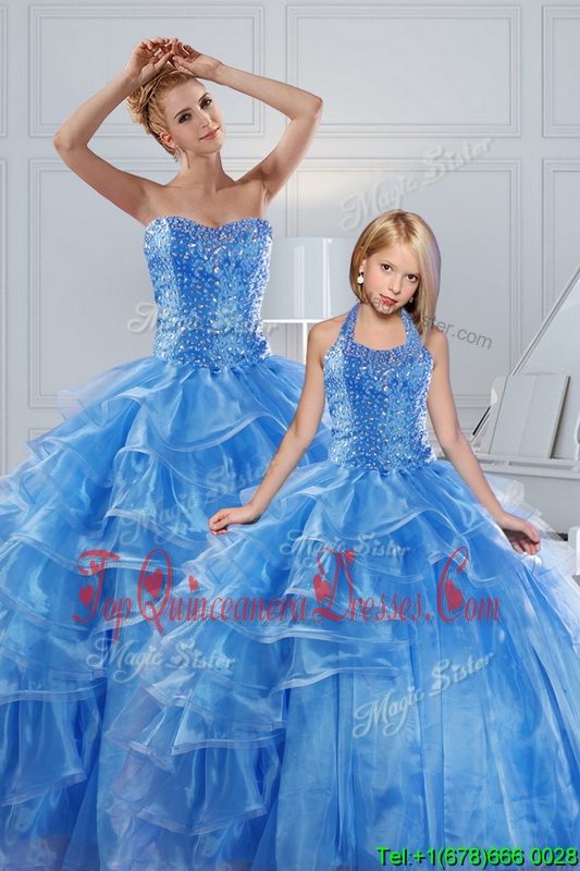 Floor Length Lace Up Ball Gown Prom Dress Baby Blue and In for Military Ball and Sweet 16 and Quinceanera with Beading and Ruffled Layers