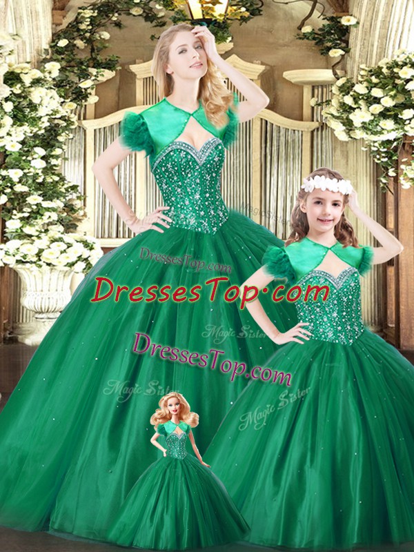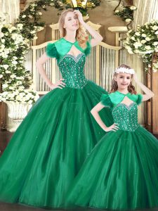 Floor Length Lace Up Ball Gown Prom Dress Green for Military Ball and Sweet 16 and Quinceanera with Beading