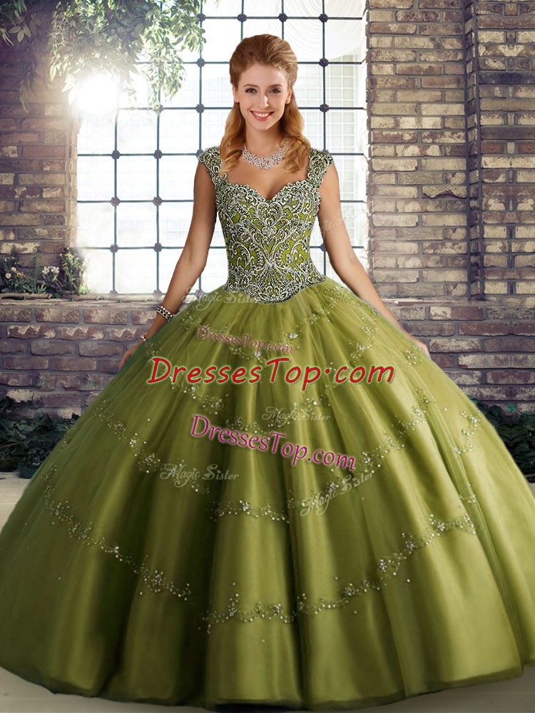 Floor Length Lace Up Ball Gown Prom Dress Olive Green for Military Ball and Sweet 16 and Quinceanera with Beading and Appliques