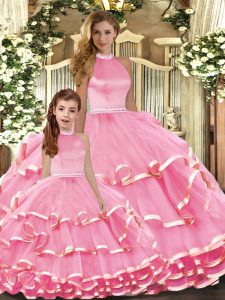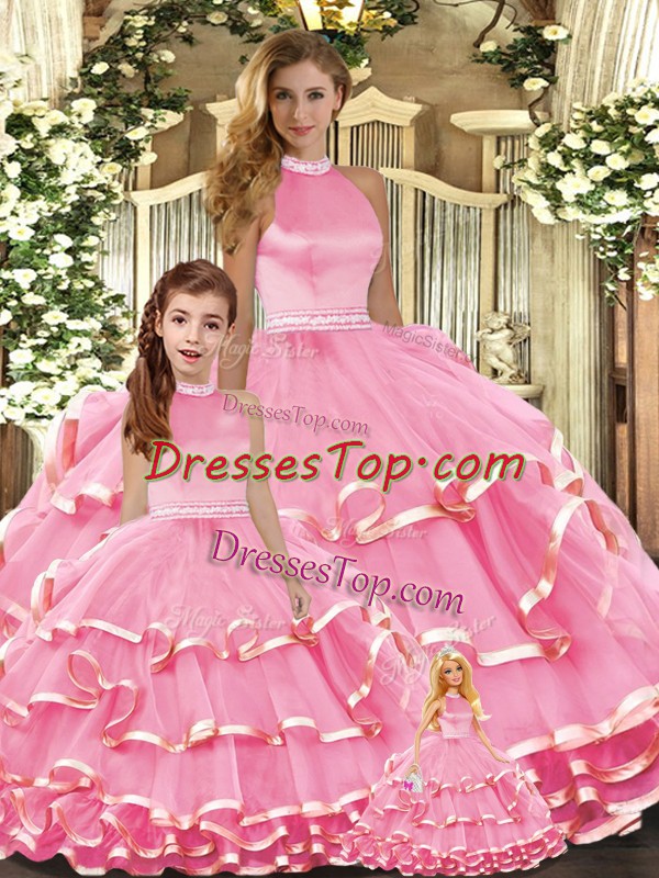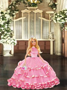 Floor Length Lace Up Ball Gown Prom Dress Pink and In with Beading and Ruffled Layers