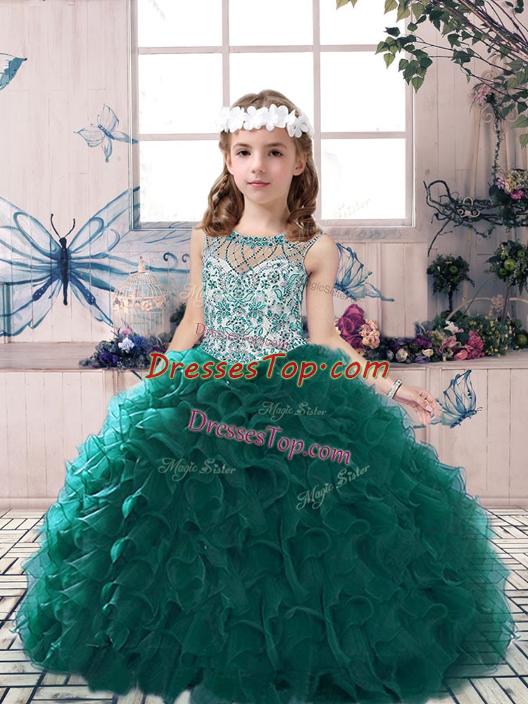 Floor Length Lace Up Evening Gowns Peacock Green for Party and Wedding Party with Beading and Ruffles