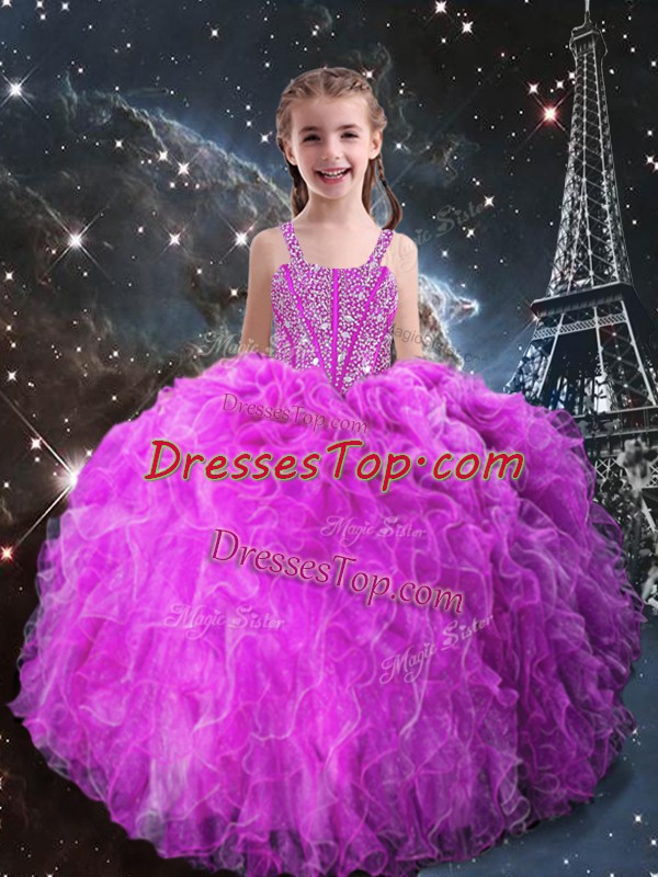 Floor Length Lace Up Kids Pageant Dress Fuchsia for Quinceanera and Wedding Party with Beading and Ruffles