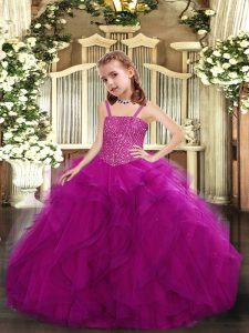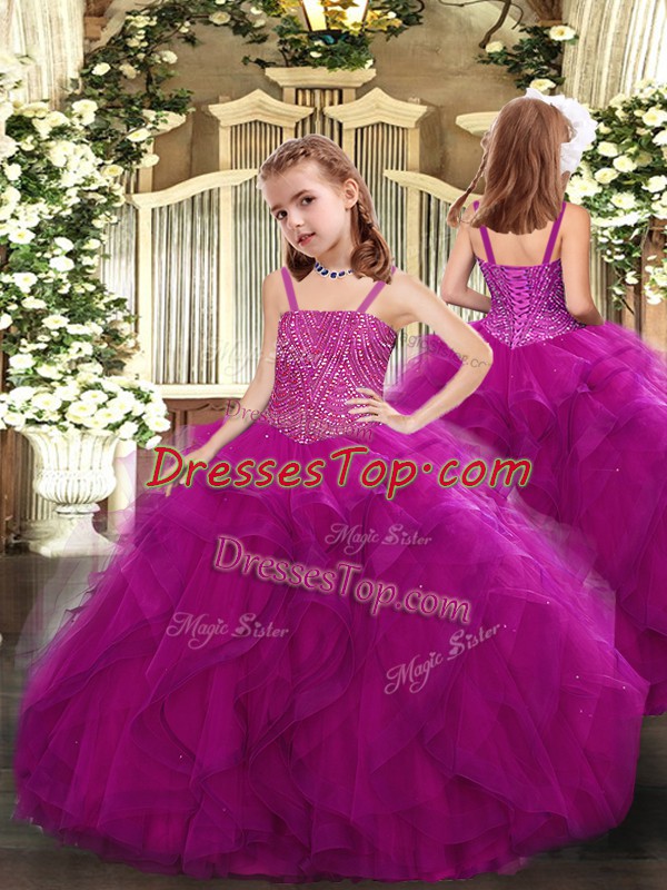 Floor Length Lace Up Kids Pageant Dress Fuchsia for Sweet 16 and Quinceanera with Beading and Ruffles
