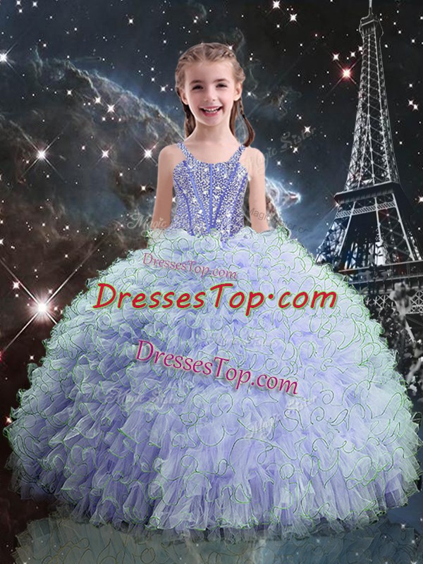 Floor Length Lace Up Little Girl Pageant Dress Light Blue for Quinceanera and Wedding Party with Beading and Ruffles