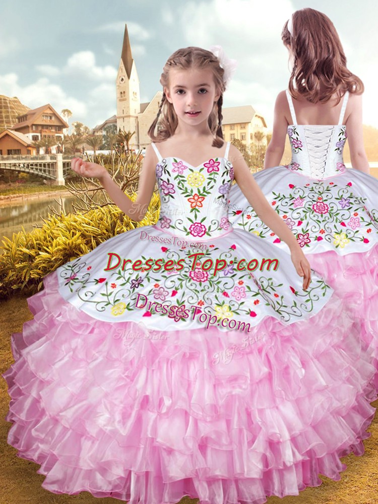 Floor Length Lace Up Little Girl Pageant Dress Rose Pink for Party and Wedding Party with Embroidery and Ruffled Layers