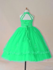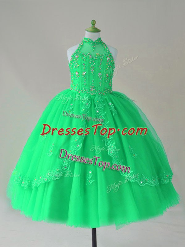 Floor Length Lace Up Little Girl Pageant Gowns Turquoise for Wedding Party with Beading and Appliques