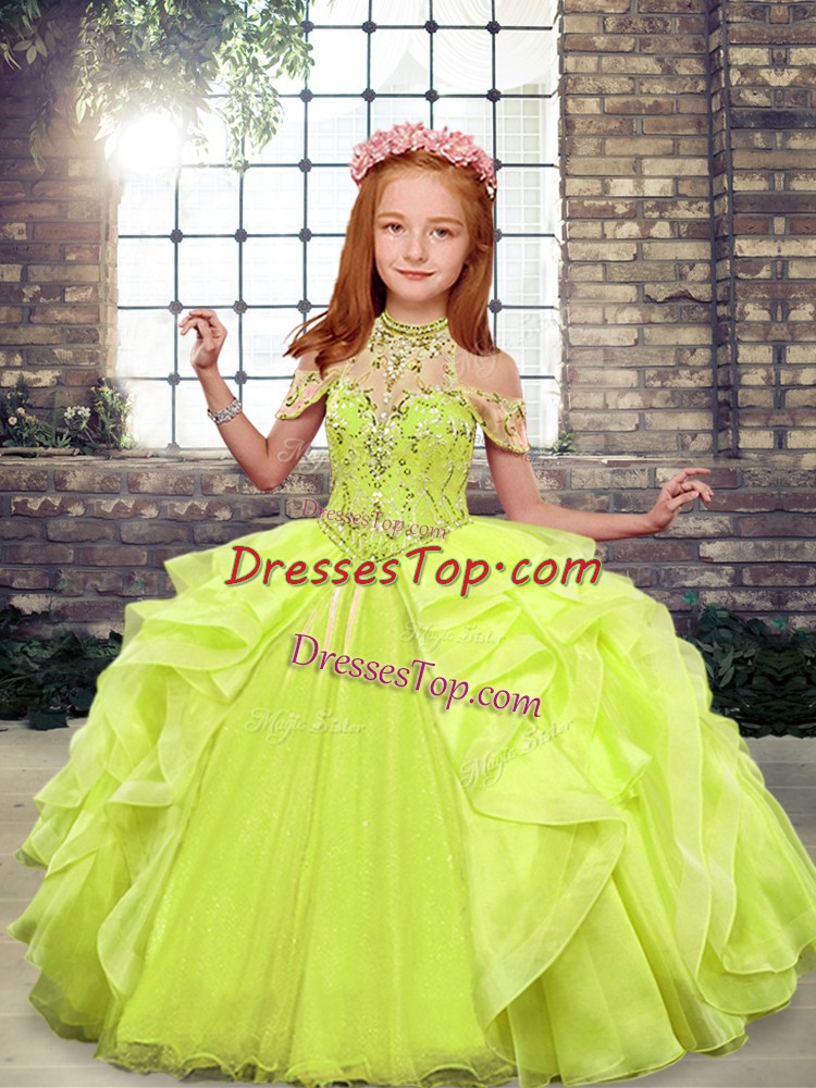 Floor Length Lace Up Little Girls Pageant Dress Wholesale Yellow Green for Party and Wedding Party with Beading