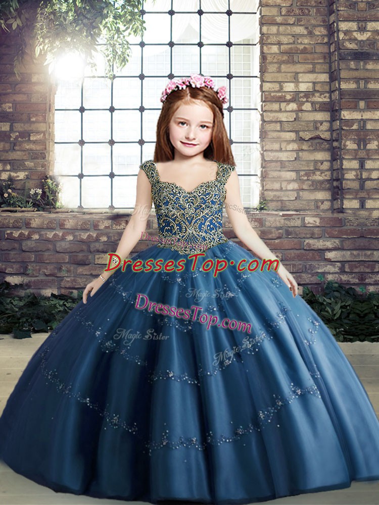 Floor Length Lace Up Little Girls Pageant Gowns Blue for Party and Wedding Party with Beading