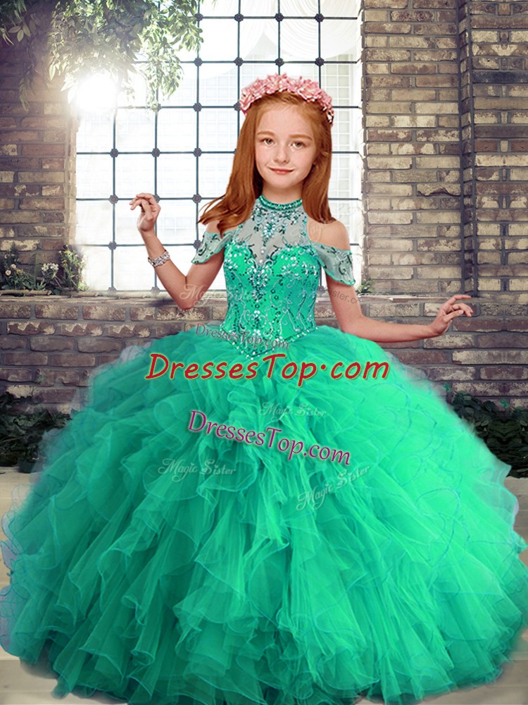 Floor Length Lace Up Pageant Gowns Turquoise for Party and Military Ball and Wedding Party with Beading and Ruffles