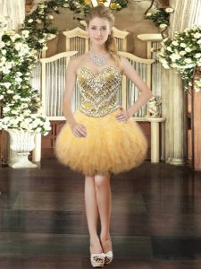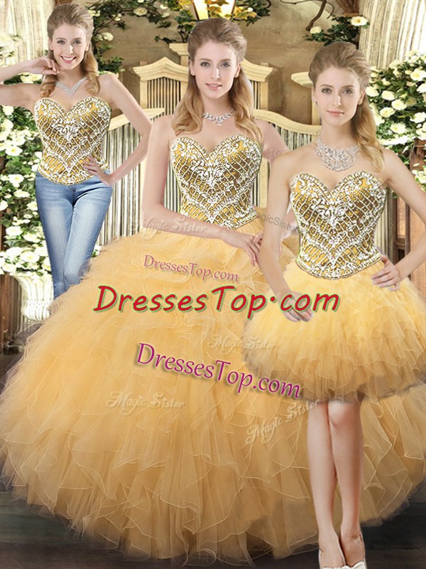 Floor Length Lace Up Quince Ball Gowns Gold for Military Ball and Sweet 16 and Quinceanera with Beading and Ruffles
