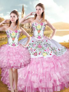 Floor Length Lace Up Quince Ball Gowns Rose Pink for Military Ball and Sweet 16 and Quinceanera with Embroidery and Ruffled Layers