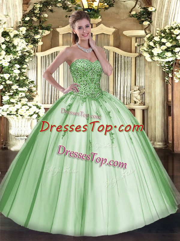 Floor Length Lace Up Quinceanera Dress Apple Green for Military Ball and Sweet 16 and Quinceanera with Beading and Appliques