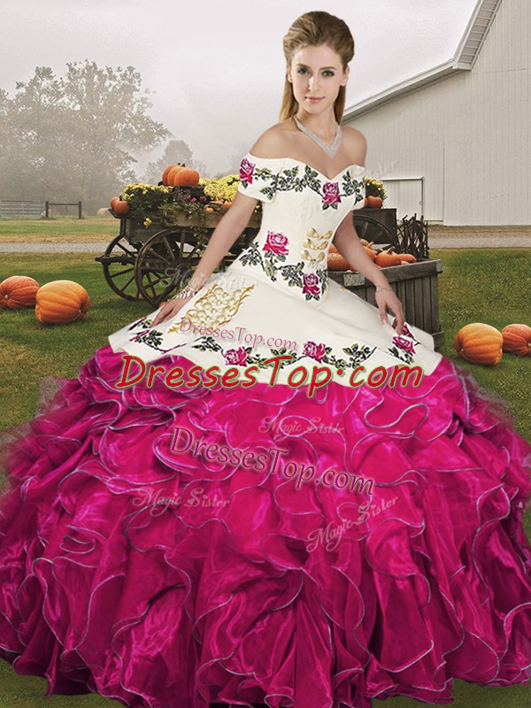 Floor Length Lace Up Quinceanera Dress Fuchsia for Military Ball and Sweet 16 and Quinceanera with Embroidery and Ruffles
