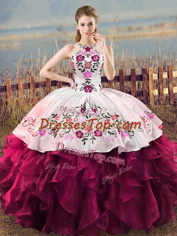 Floor Length Lace Up Quinceanera Dress Fuchsia for Sweet 16 and Quinceanera with Embroidery and Ruffles