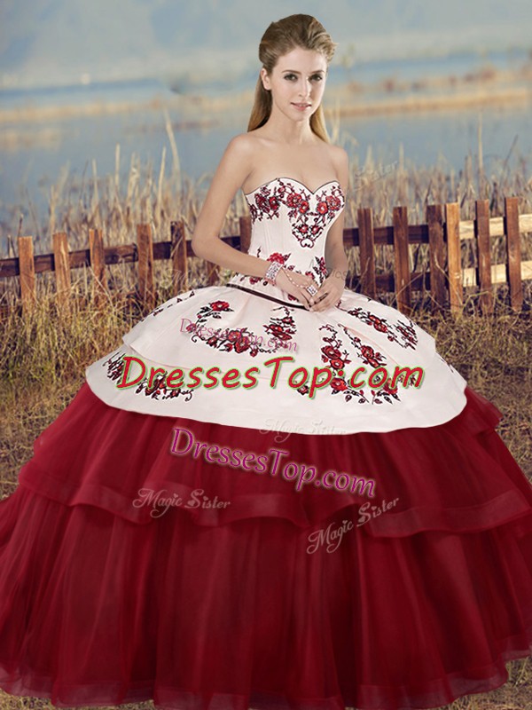 Floor Length Lace Up Quinceanera Dress White And Red for Military Ball and Sweet 16 and Quinceanera with Embroidery and Bowknot