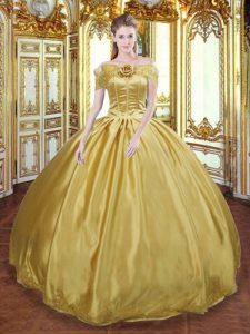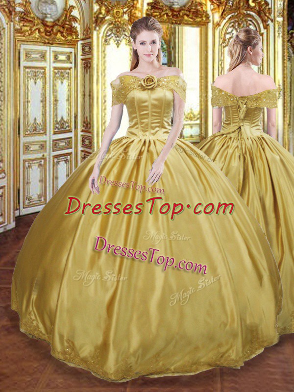 Floor Length Lace Up Quinceanera Dresses Gold for Military Ball and Sweet 16 and Quinceanera with Beading and Appliques and Hand Made Flower