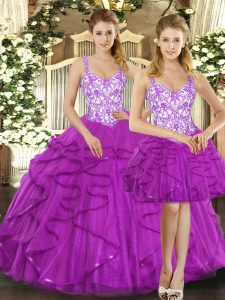 Floor Length Lace Up Quinceanera Gowns Fuchsia for Military Ball and Quinceanera with Beading and Ruffles