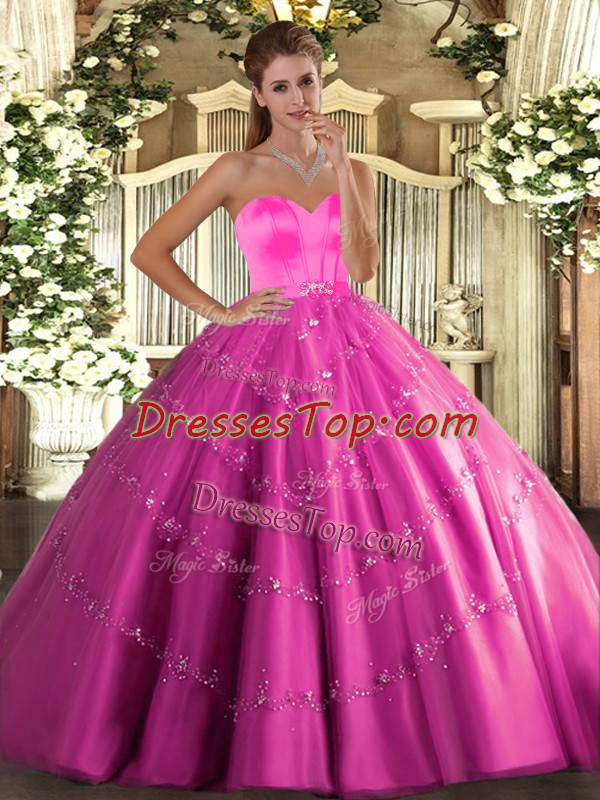 Floor Length Lace Up Quinceanera Gowns Hot Pink for Military Ball and Sweet 16 and Quinceanera with Beading and Appliques