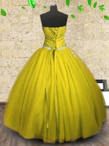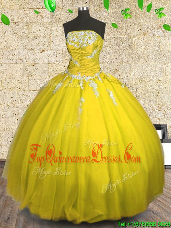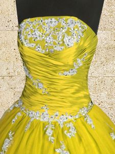 Floor Length Lace Up Quinceanera Gowns Yellow and In for Military Ball and Sweet 16 and Quinceanera with Appliques and Ruching