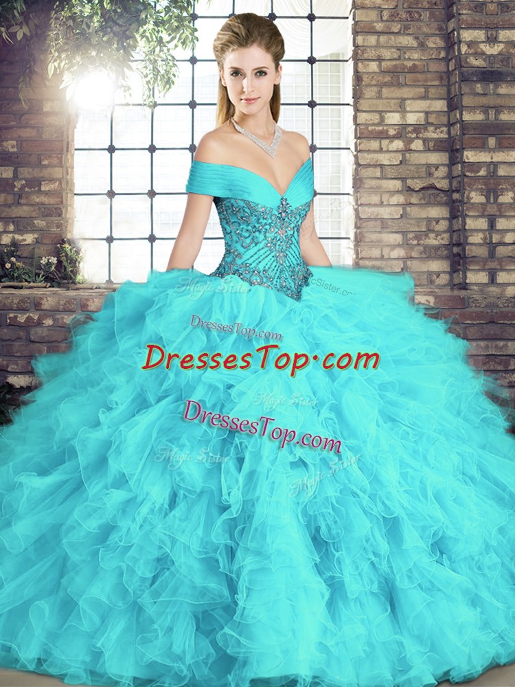 Floor Length Lace Up Sweet 16 Dress Aqua Blue for Military Ball and Sweet 16 and Quinceanera with Beading and Ruffles
