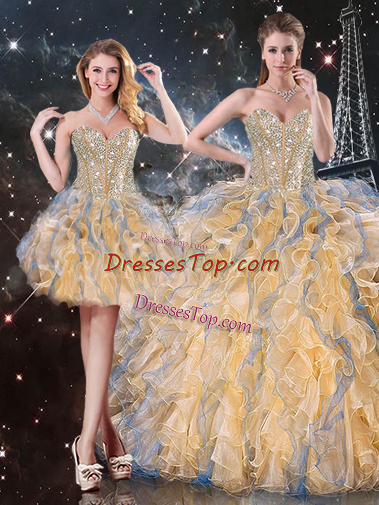 Floor Length Lace Up Sweet 16 Dress Gold for Military Ball and Sweet 16 and Quinceanera with Beading and Ruffles
