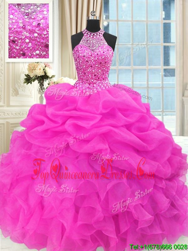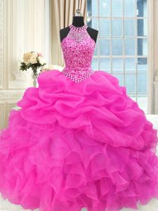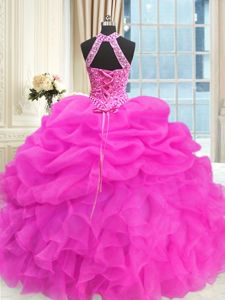 Floor Length Lace Up Sweet 16 Dress Hot Pink and In for Military Ball and Sweet 16 and Quinceanera with Beading and Pick Ups